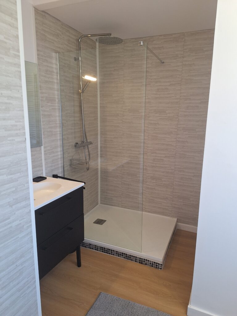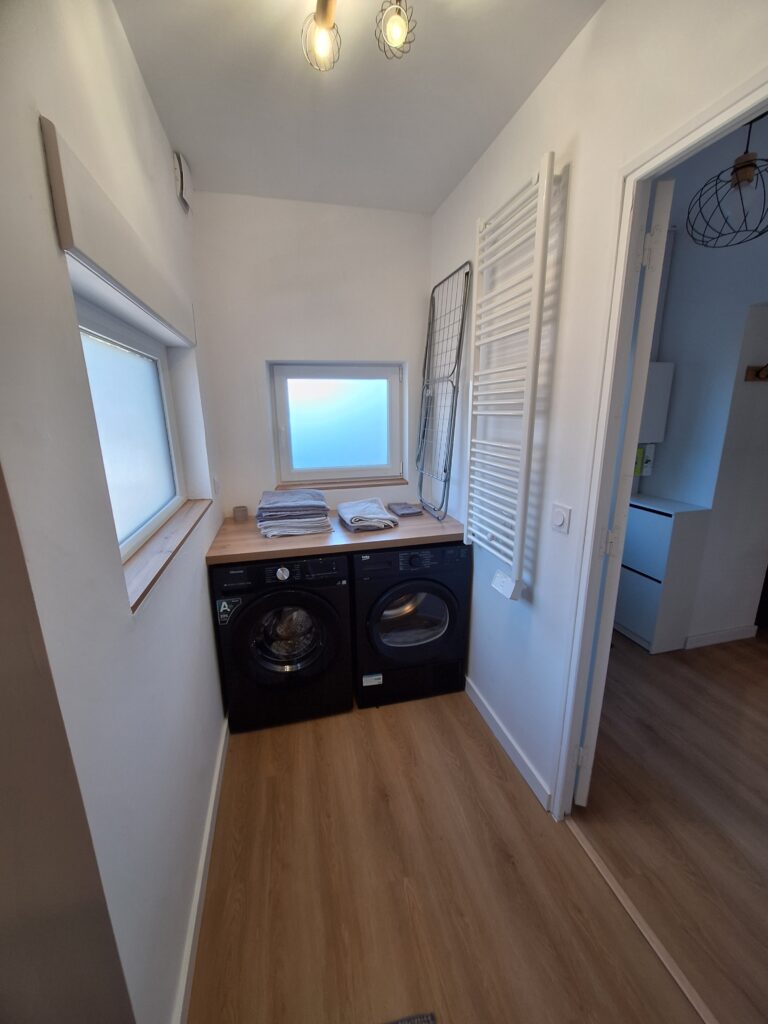 – Une salle de bain avec douche, sèche-cheveux, lave-linge, sèche-linge